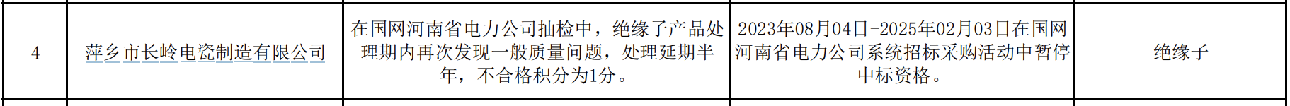公告显示,萍乡市长岭电瓷制造有限公司,在国网河南省电力公司抽检中,绝缘子产品处 理期内再次发现一般质量问题,处理延期半 年,不合格积分为1分。