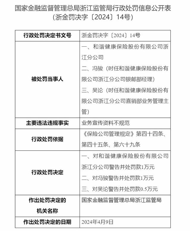 国家金融监督管理总局网站发布的行政处罚信息公开表显示,因业务宣传资料不规范的违法违规行为,和谐健康保险股份有限公司浙江分公司被罚款1万元。公开信息显示,和谐健康保险股份有限公司于2006年1月12日正式设立,注册资本139亿元,截至2022年末资产总额为3916.99亿元,全年实现营业收入355.98亿元,其中原保费收入194.45 亿元。