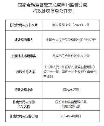 根据国家金融监督管理总局网站近日发布的行政处罚信息公开表(荆金监罚决字〔2024〕2号)显示,因发放不符合条件的个人贷款,国家金融监督管理总局荆州监管分局对中国光大银行股份有限公司荆州分行罚款25万元。