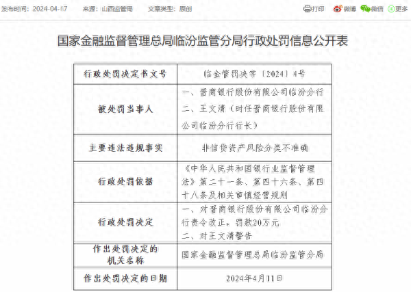 4月17日,国家金融监督管理总局临汾监管分局行政处罚信息公开表显示,晋商银行临汾分行因非信贷资产风险分类不准确,被责令改正,罚款20万元;作出处罚决定的日期为2024年4月11日。