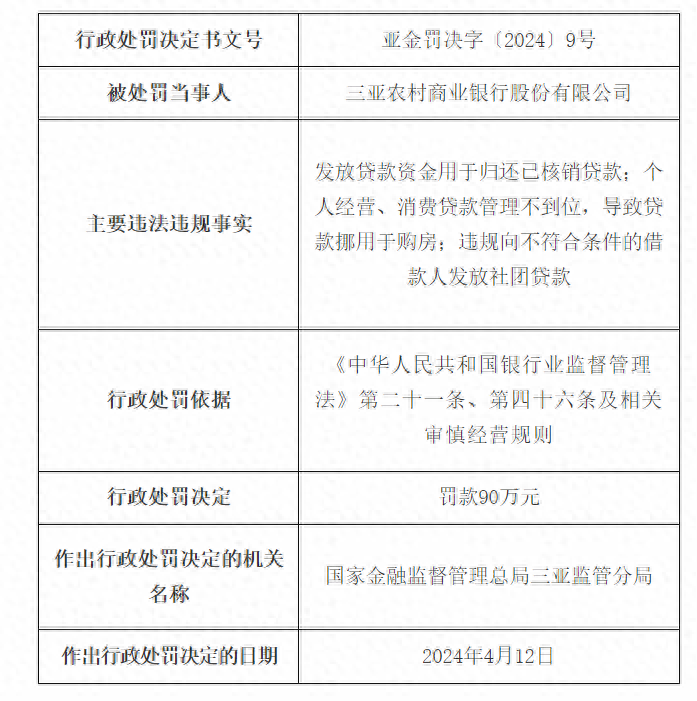 据国家金融监督管理总局网站消息,近日三亚农村商业银行股份有限公司(以下简称“三亚农商行”)因“发放贷款资金用于归还已核销贷款;个人经营、消费贷款管理不到位,导致贷款挪用于购房;违规向不符合条件的借款人发放社团贷款”,被罚90万元。