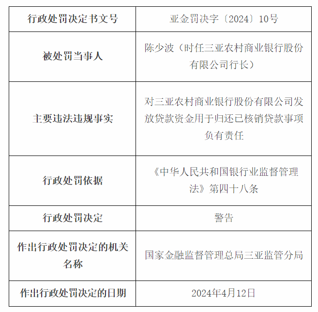 时任三亚农村商业银行股份有限公司行长陈少波,对三亚农村商业银行股份有限公司发放贷款资金用于归还已核销贷款事项负有责任,被警告。
