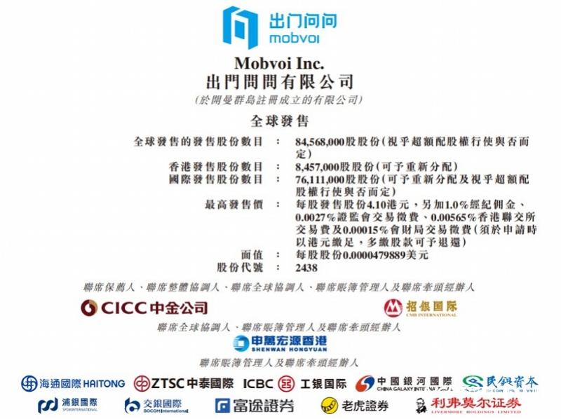 4月16日,香港交易所公告显示,出门问问拟通过香港IPO全球发售8456.8万股股份(视乎超额配股权行使与否而定),其中,香港公开发售845.7万股股份,国际发售7611.1万股股份,招股于19日结束,预期定价日为4月22日。而后,出门问问计划于4月24日,以“2438”为股票代码正式在港交所主板挂牌上市。