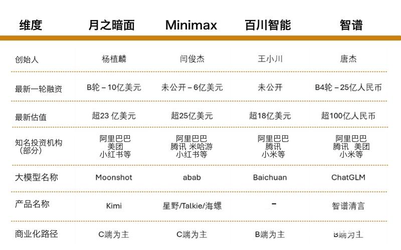 对比其他AI大模型创业公司来看,出门问问面临的竞争也十分激烈。其中智谱、月之暗面、MiniMax和百川智能这四家公司在今年频获融资,估值迅速超过100亿人民币,被称为生成式AI时代的“新AI四小龙”。