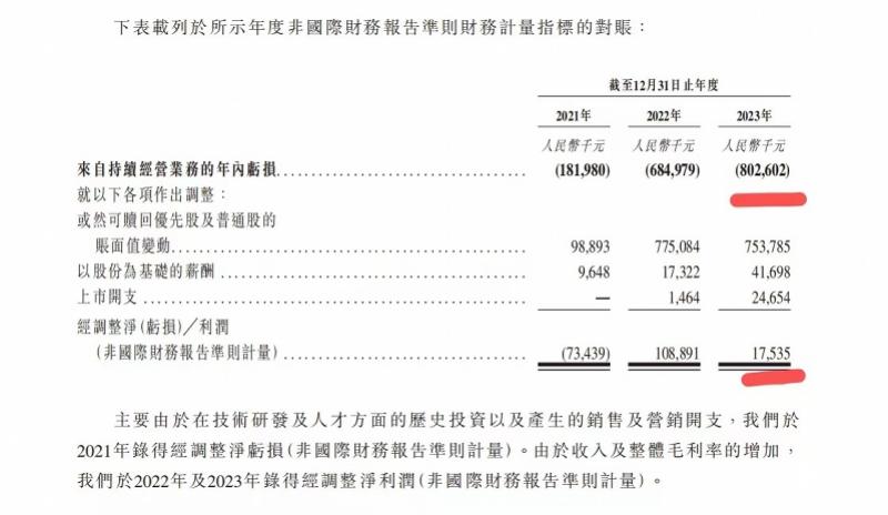 另一边,出门问问近三年来亏损不断。招股书显示,从2021年至2023年,来自持续经营业务的亏损依次为1.82亿元、6.85亿元及8.03亿元。经调整后(经扣除或然可赎回优先股及普通股的账面值变动等因素)净利润,在2022年实现扭亏盈利1.09亿元,但2023年盈利又降至0.18亿元,下滑幅度达83.5%。