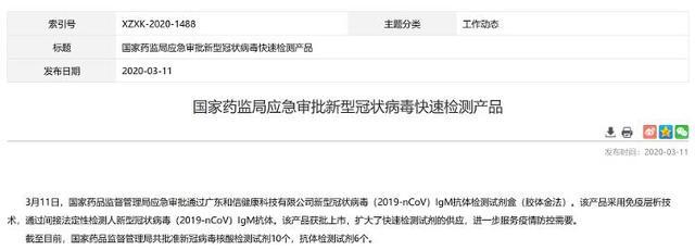 2020年3月,国家药监局应急审批通过和信健康新型冠状病毒(2019-nCoV)IgM抗体检测试剂盒(胶体金法),是国内最早期获批新冠病毒抗体检测产品的公司之一。