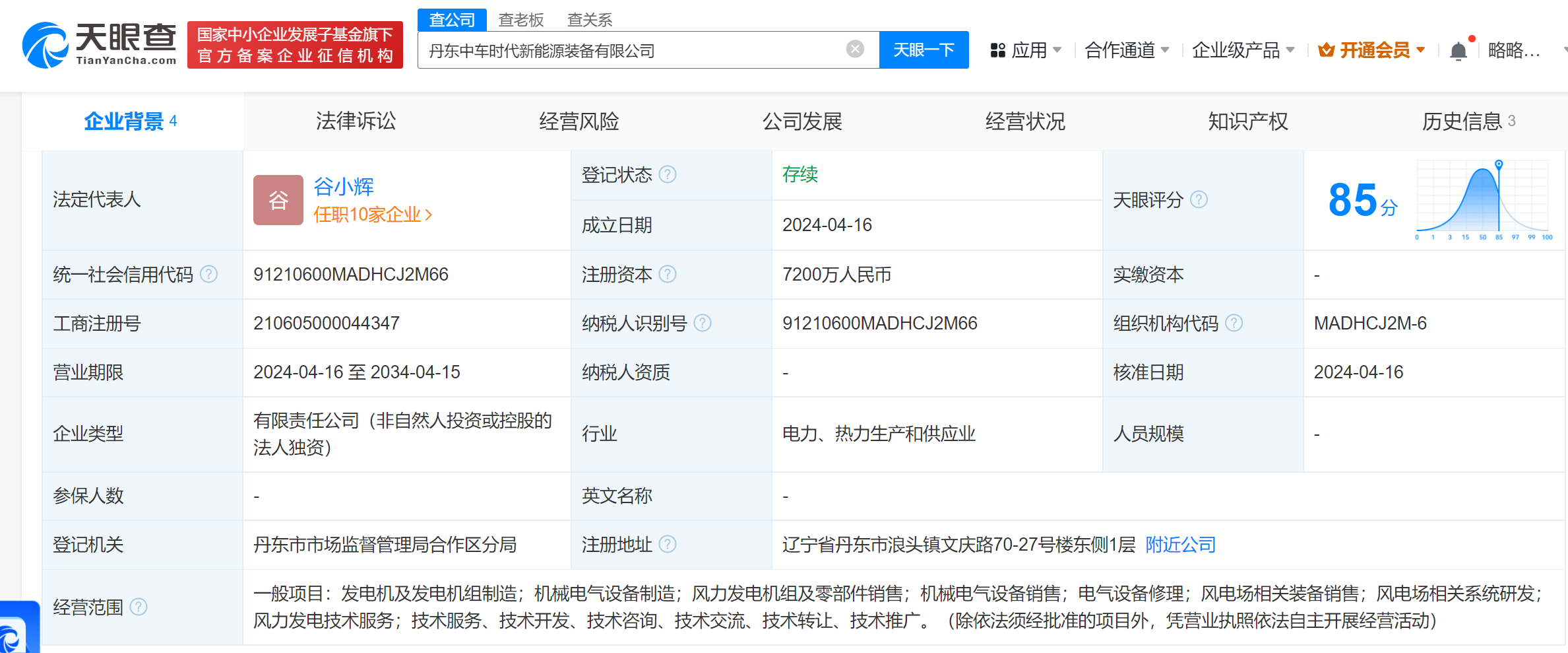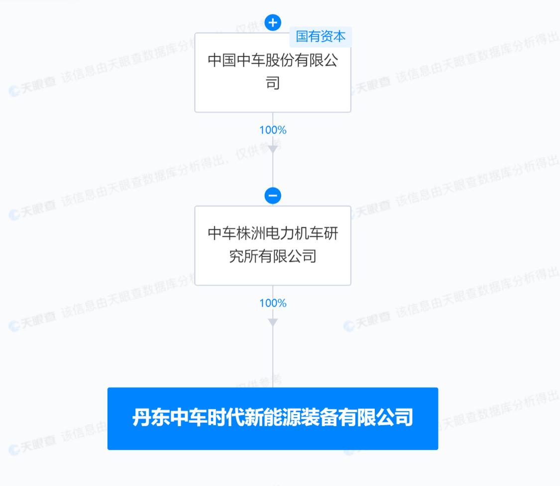 天眼查App显示,近日,丹东中车时代新能源装备有限公司成立,法定代表人为谷小辉,注册资本7200万元,经营范围含发电机及发电机组制造、机械电气设备制造、风力发电机组及零部件销售等。股权全景穿透图显示,该公司由中车株洲电力机车研究所有限公司全资持股,后者为中国中车全资子公司。