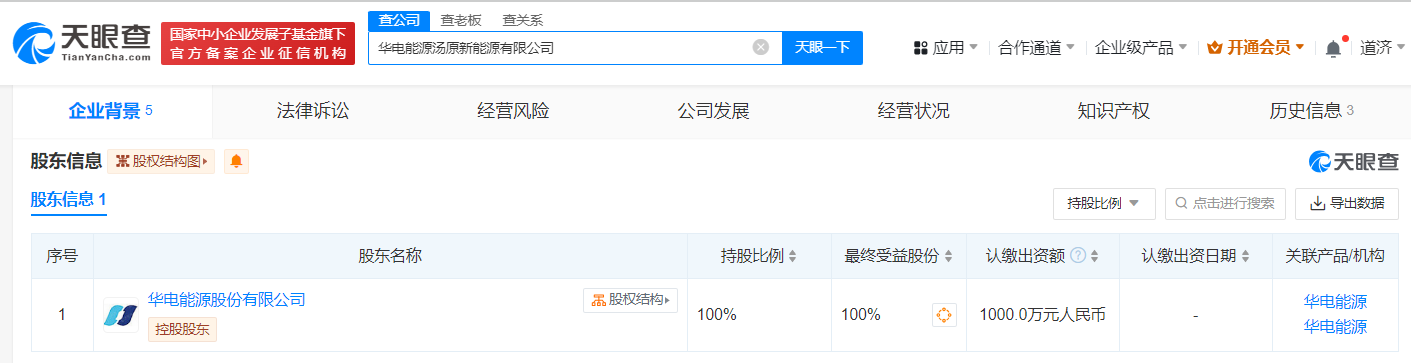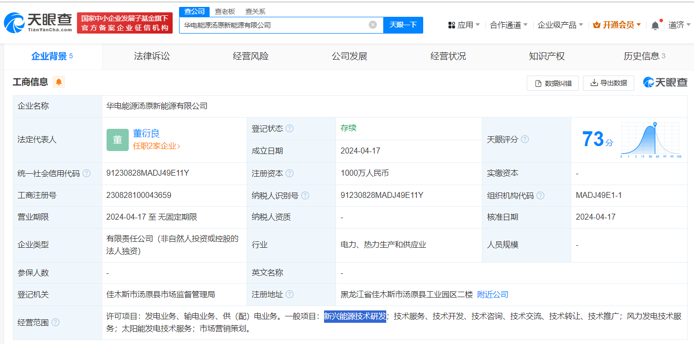 天眼查App显示,近日,华电能源汤原新能源有限公司成立,法定代表人为董衍良,注册资本1000万人民币,经营范围含新兴能源技术研发、风力发电技术服务、太阳能发电技术服务等。股东信息显示,该公司由华电能源(600726)全资控股。