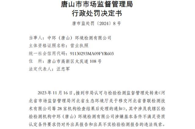 处罚文号为唐市监处罚〔2024〕8号罚单内容显示,中环检测人出具不实检验检测报告的行为违反了《检验检测机构监督管理办法》第十三条第一款的规定,依据《检验检测机构监督管理办法》第二十六条第一项的规定,鉴于当事人已于2023年9月30日前将存在的问题整改完成。唐山市市场监督管理局经研究决定,对中环检测作出如下行政处罚:罚款3万元(大写:叁万元)。罚单公布日期2024年1月24日。