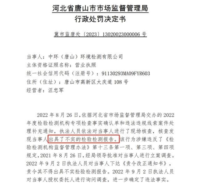 处罚文号为唐市监处罚〔2022〕140号的罚单内容显示,中环检测出具不实检验检测报告的行为违反了《检验检测机构监督管理办法》第十三条第一项、第三项、第四项规定。唐山市市场监督管理局依据《检验检测机构监督管理办法》第二十六条第一项,对中环检测处3万元罚款,处罚决定书送达日期2022年12月22日。