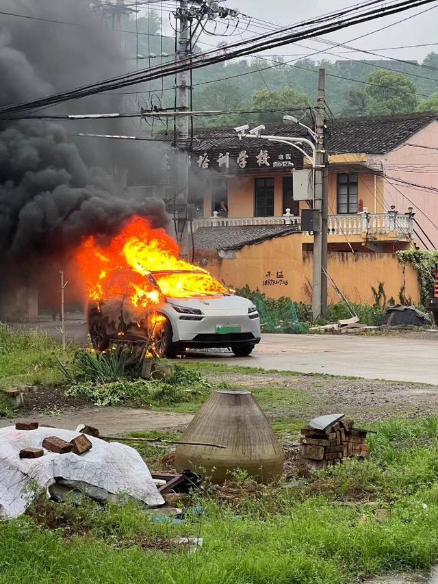 在多段视频中,这辆车身大面积着火、冒着滚滚黑烟的灰色电车停在乡村道路边,燃烧过程中还伴有爆裂声,火星飞溅。现场两侧是农村自建房,路上鲜少有其他车辆往来。根据车标和外观,该车疑似为广州汽车集团股份有限公司旗下“广汽埃安”V系列车型。