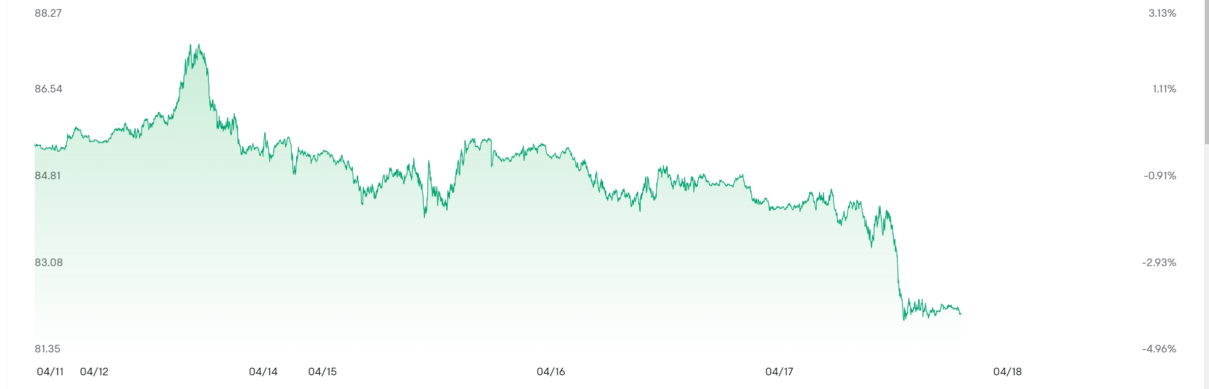 本周三,布伦特原油6月期货收跌2.73美元,至每桶87.29美元,跌幅3%;美国原油5月期货收跌2.67美元,至每桶82.69美元,跌幅3.1%,为3月20日以来最大跌幅。