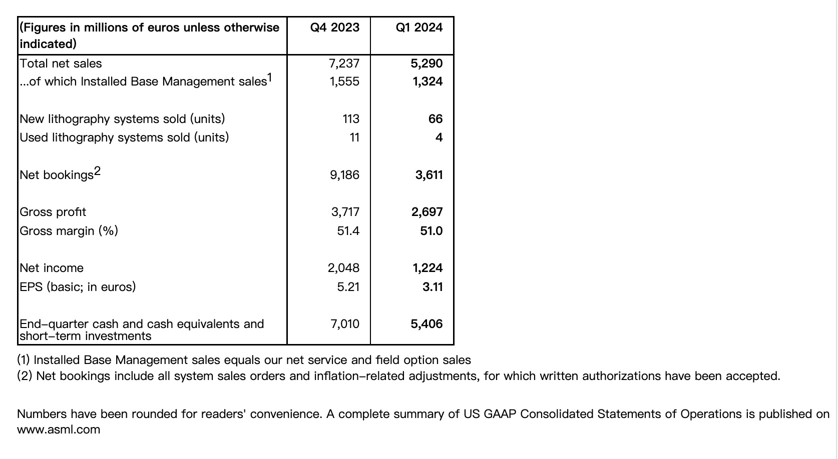 4月17日,荷兰光刻机公司阿斯麦(ASML)“爆雷”了!在今日发布2024年第一季度财报中显示,2024年第一季度,ASML实现净销售额52.9亿欧元,环比下降27%。毛利率为51%,净收入从20.48亿欧元下降至12.24亿欧元。