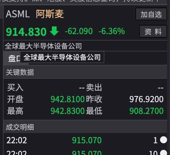 受此影响,阿斯麦开盘跌4%。截至收盘,阿斯麦跌超7%。