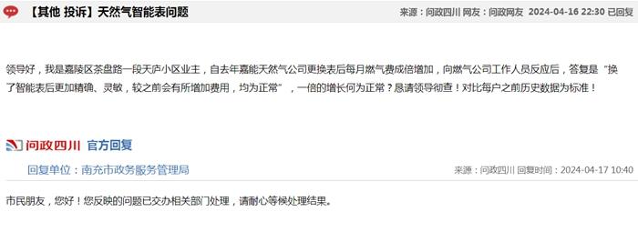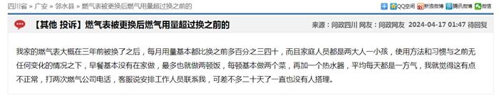 中新网4月17日电(中新财经记者 吴涛)近日,在“问政四川”平台上,不少网友反映“更换新表后燃气费异常上涨”,这些留言显示来自四川成都、自贡、广安、南充等多地,仅仅在4月16日,保守估计就有十几条;17日上午又出现十几条。大部分尚未得到回复,部分获得官方回复称“留言已转交给相关机构进行处理”。
