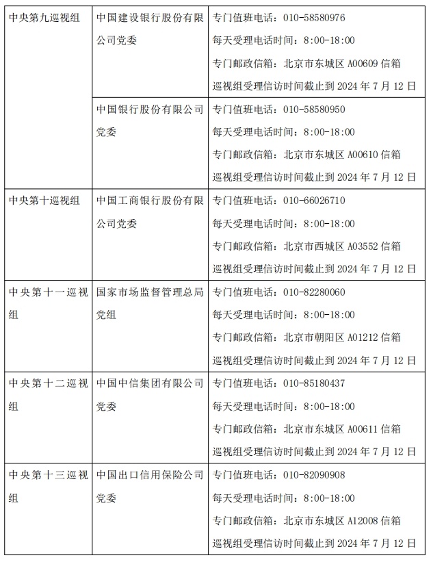 经党中央批准,二十届中央第三轮巡视将对国家发展和改革委员会、财政部、自然资源部、住房和城乡建设部、农业农村部、商务部、中国人民银行、审计署、海关总署、国家税务总局、国家市场监督管理总局、国家金融监督管理总局、中国证券监督管理委员会、国家统计局、国家知识产权局、国家粮食和物资储备局、国家能源局、国家林业和草原局、国家外汇管理局、中华全国供销合作总社、全国社会保障基金理事会、中国地质调查局、上海证券交易所、深圳证券交易所、中国进出口银行、中国工商银行股份有限公司、中国农业银行股份有限公司、中国银行股份有限公司、中国建设银行股份有限公司、交通银行股份有限公司、中国中信集团有限公司、中国人寿保险(集团)公司、中国太平保险集团有限责任公司、中国出口信用保险公司等34家单位党委(党组)开展常规巡视。