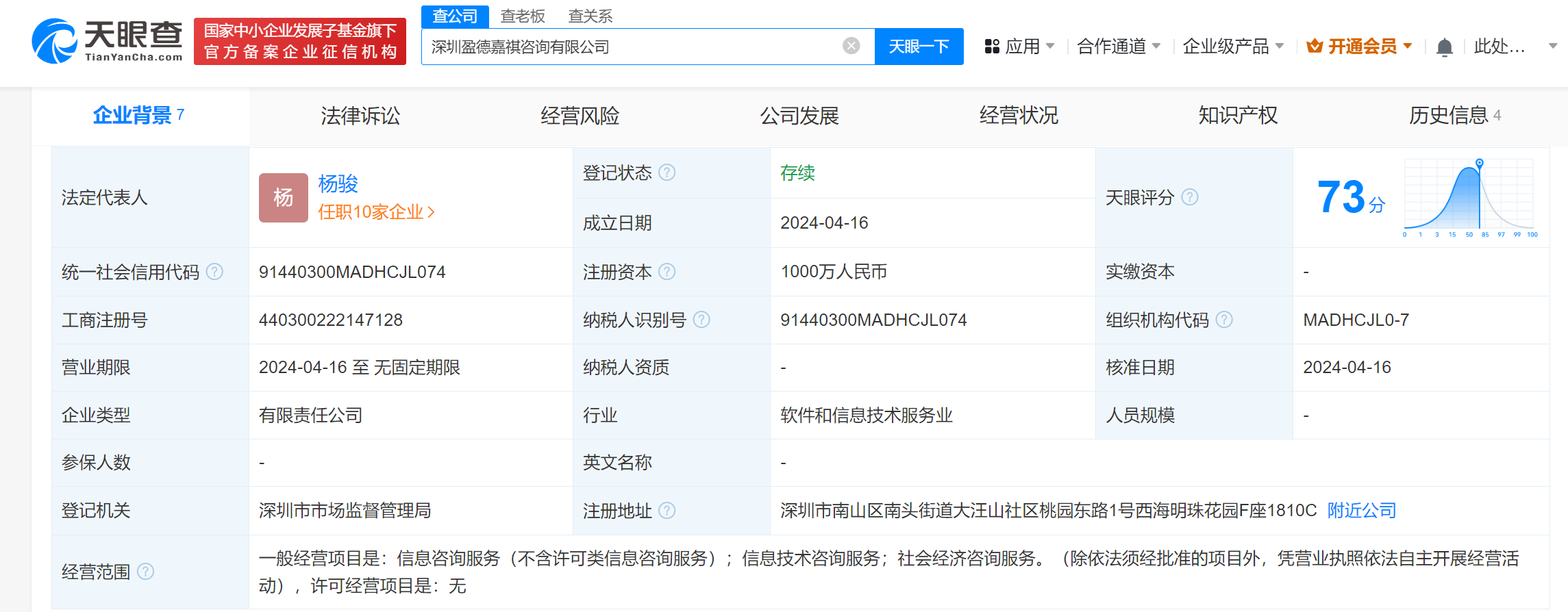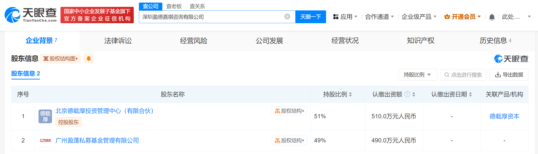 天眼查App显示,近日,深圳盈德嘉祺咨询有限公司成立,法定代表人为杨骏,注册资本1000万人民币,经营范围含信息咨询服务、信息技术咨询服务、社会经济咨询服务。股东信息显示,该公司由德载厚资本关联企业北京德载厚投资管理中心(有限合伙)与广汽资本旗下广州盈蓬私募基金管理有限公司分别持股51%、49%。