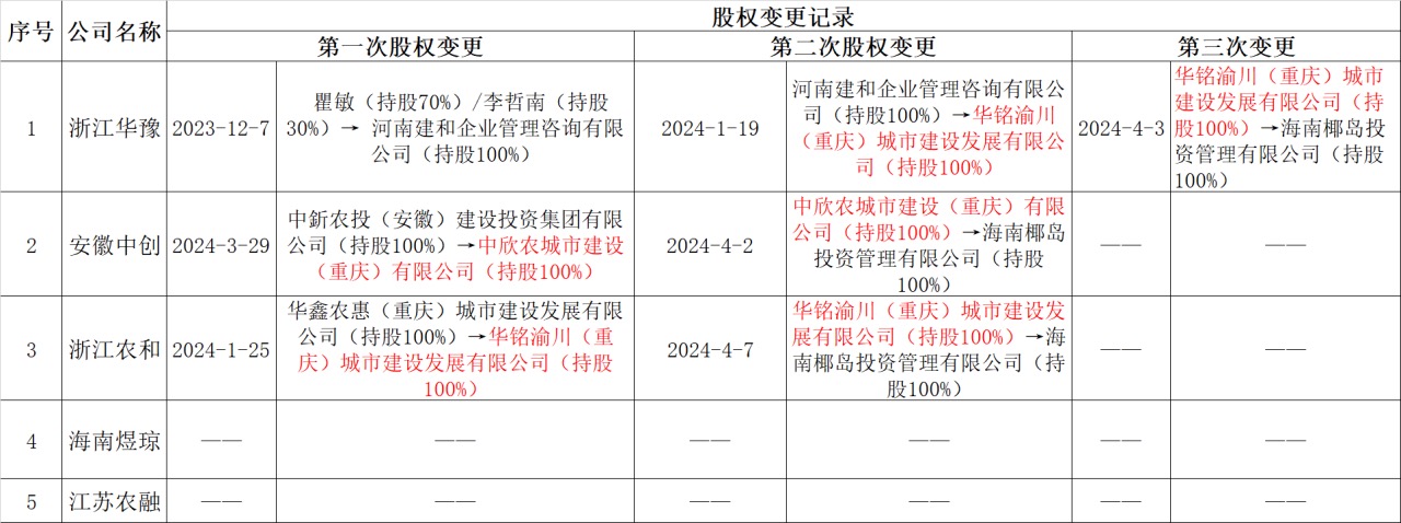 浙江华豫曾在2024年1月,将股东变更为华铭渝川(重庆)城市建设发展有限公司(以下简称“重庆华铭”)全资持股,后又于2024年4月变更为椰岛投资全资持股;安徽中创于2021年4月7日,将中欣农投(安徽)建设投资集团有限公司(以下简称“安徽中欣”)100%持股变更为椰岛投资全资持股;浙江农和于2024年4月将重庆华铭100%持股变更为椰岛投资全资持股。