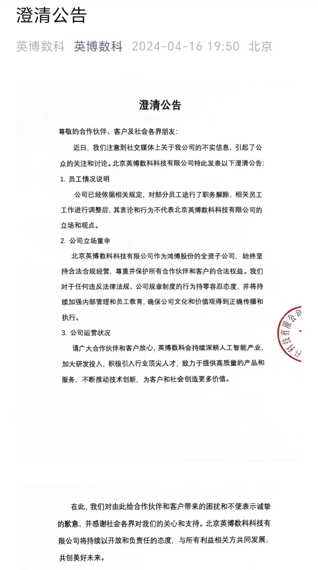 1.员工情况说明:公司已经依据相关规定,对部分员工进行了职务解除,相关员工工作进行调整后,其言论和行为不代表北京英博数科科技有限公司的立场和观点。