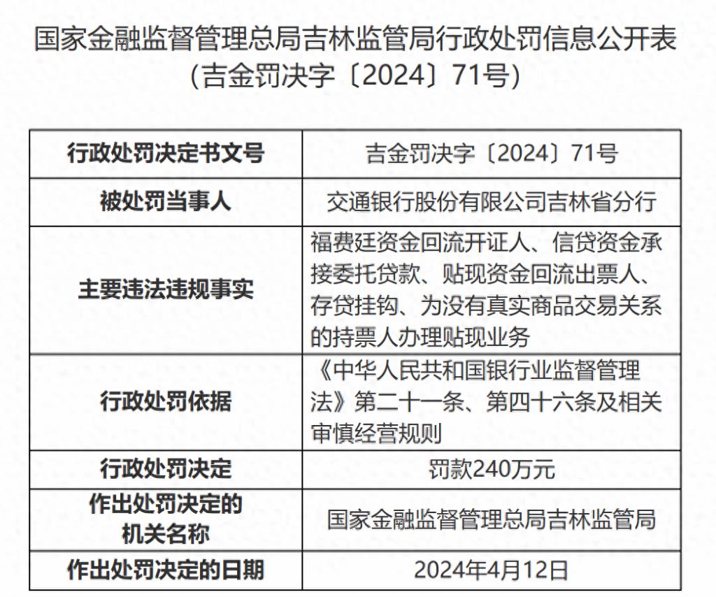 近日,国家金融监督管理总局吉林监管局披露的行政处罚信息显示,交通银行股份有限公司吉林省分行因存在以下主要违法违规事实:福费廷资金回流开证人、信贷资金承接委托贷款、贴现资金回流出票人、存贷挂钩、为没有真实商品交易关系的持票人办理贴现业务,被罚款 240 万元。