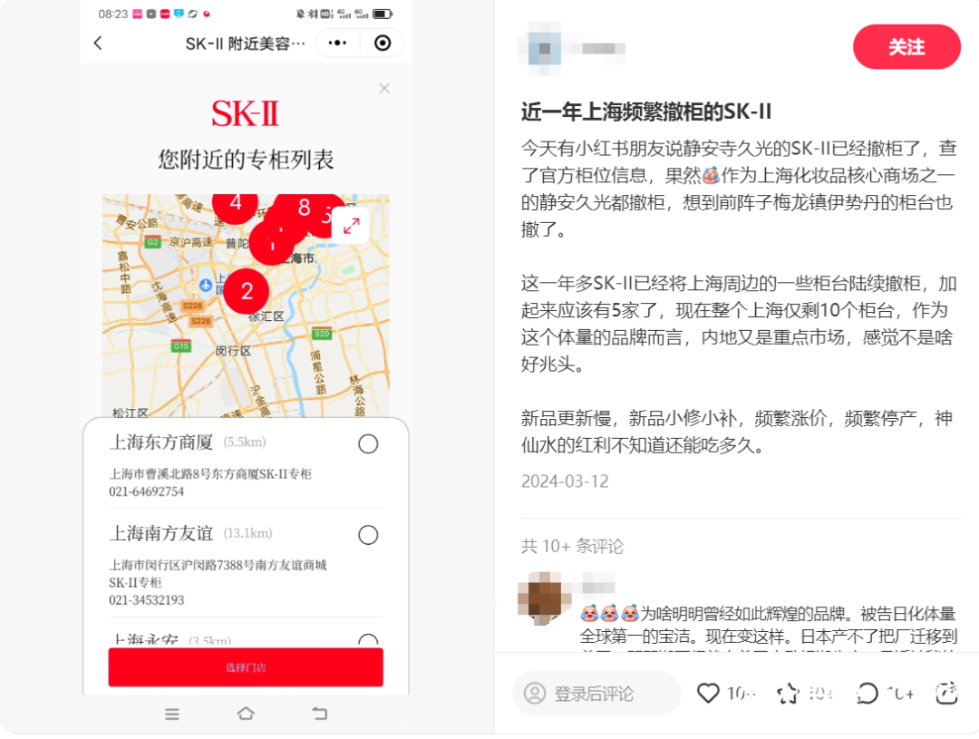3月12日,有网友发帖称近一年SK-II频繁在上海撤柜,并称撤柜应该有5家了,目前上海仅剩10个SK-II专柜,“感觉不是啥好兆头。新品更新慢,新品小修小补,频繁涨价、频繁停产,神仙水的红利不知道还能吃多久。”