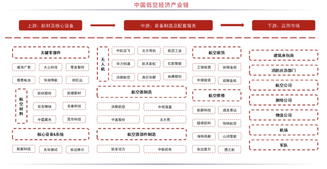 中信证券在近期研报中指出,低空经济的产业链长、辐射范围广,上游主要为构建中游各类低空产品的原材料(包括金属原材料、特种橡胶与高分子材料等)与核心零部件(包括电池、电机、飞控、机体等);中游主要为低空产品制造、低空飞行、低空保障与综合服务等;下游主要为运营和各种应用场景(包括旅游业、物流业、文旅业与巡检业等)。