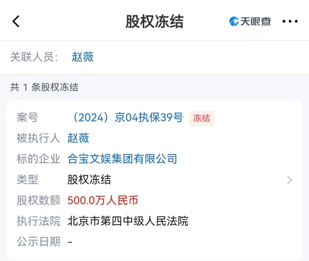 天眼查信息显示,4月11日,赵薇名下部分所持股权被冻结,冻结股权标的企业为合宝文娱集团有限公司,执行法院为北京市第四中级人民法院,被冻结股权金额为500万元人民币,冻结期限至2027年4月10日。