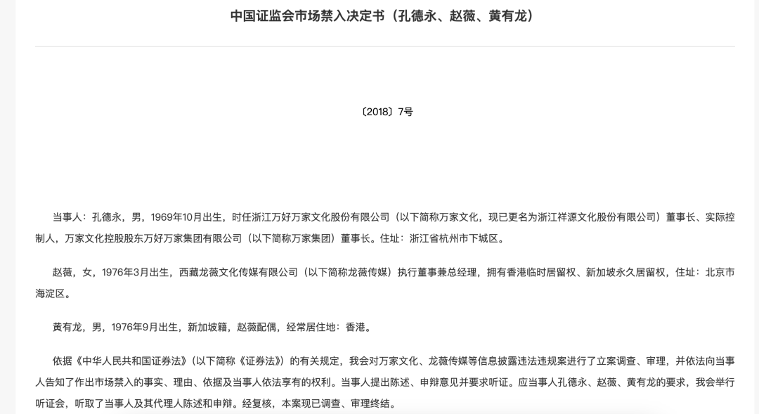 早在2018年,赵薇还曾接到证监会罚单。当年4月,证监会发布了《行政处罚决定书》及《市场禁入决定书》,对万家文化、龙薇传媒责令改正,给予警告,并分别处以60万元罚款;对孔德永、黄有龙、赵薇、赵政给予警告,并分别处以30万元罚款,对黄有龙、赵薇、孔德永分别采取5年证券市场禁入措施。(更多内容请戳:《赵薇夫妇被证监会顶格处罚,让他们真正害怕的可能是巨额索赔以及……》)