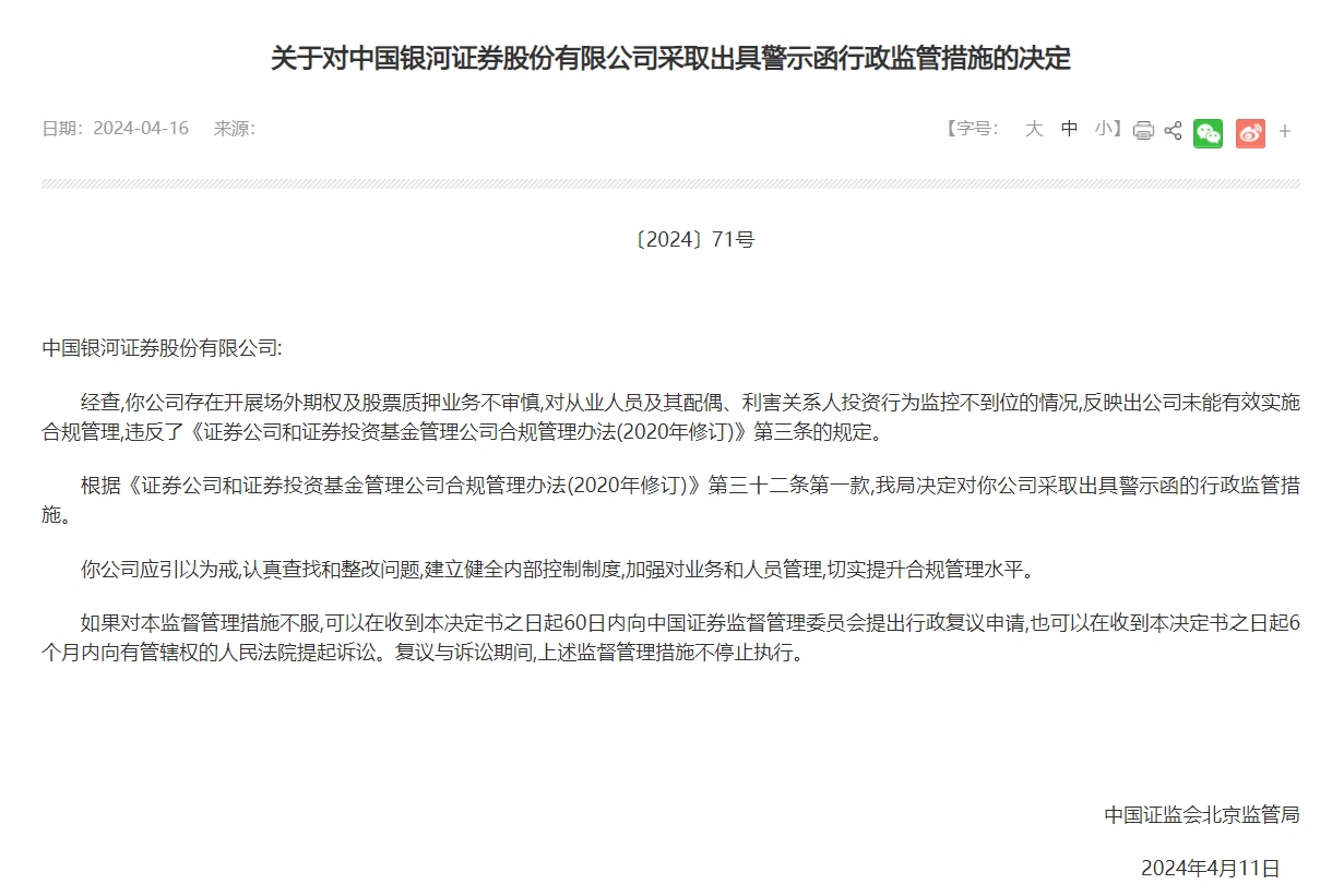北京证监局近日发布关于对中国银河证券股份有限公司采取出具警示函行政监管措施的决定,经查,公司存在开展场外期权及股票质押业务不审慎,对从业人员及其配偶、利害关系人投资行为监控不到位的情况,反映出公司未能有效实施合规管理,违反了《证券公司和证券投资基金管理公司合规管理办法(2020年修订)》第三条的规定。