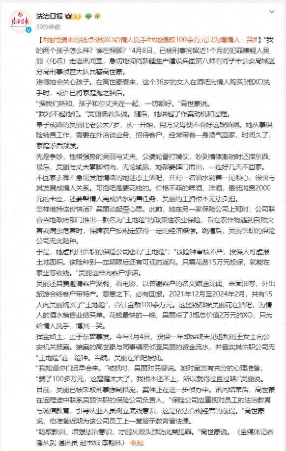 吴丽还自费邀请客户聚餐、看电影,以答谢客户的名义赠送玩偶、米面油等,外出旅游会给客户带特产。恩惠之下,必有回报。2021年12月至2024年2月,共有15人向吴丽购买了“土地险”,合计金额100余万元。这些钱都被吴丽花在酒吧,为情人的酒水销售业绩买单。花钱最快的一晚,吴丽点了3瓶总价值2万元的XO,只为给情人洗手,博其一笑。