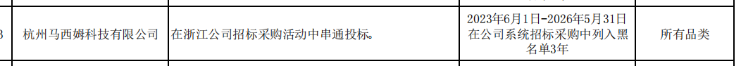 其中,杭州马西姆科技有限公司因在浙江公司招标采购活动中串通投标。处理措施:2023年6月1日-2026年5月31日 在公司系统招标采购中列入黑名单3年。处理范围:所有品类。