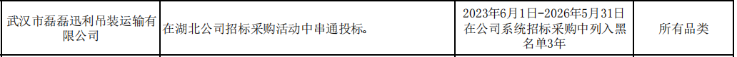 其中,武汉市磊磊迅利吊装运输有限公司因在湖北公司招标采购活动中串通投标。处理措施:2023年6月1日-2026年5月31日 在公司系统招标采购中列入黑名单3年。处理范围:所有品类。