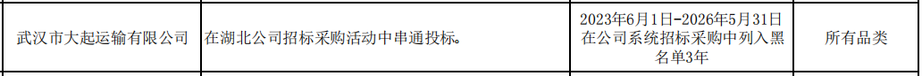 其中,武汉市大起运输有限公司因在湖北公司招标采购活动中串通投标。处理措施:2023年6月1日-2026年5月31日 在公司系统招标采购中列入黑名单3年。处理范围:所有品类。