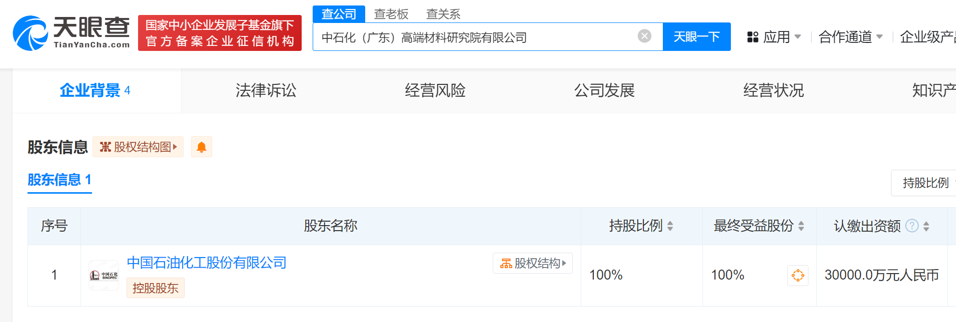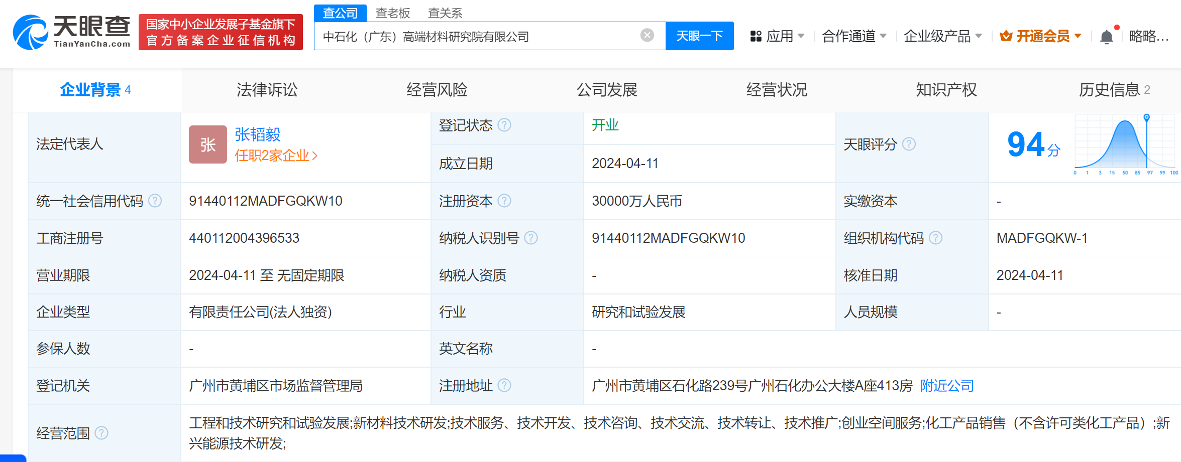 天眼查App显示,近日,中石化(广东)高端材料研究院有限公司成立,法定代表人为张韬毅,注册资本3亿人民币,经营范围含工程和技术研究和试验发展、新材料技术研发、创业空间服务、新兴能源技术研发等。股东信息显示,该公司由中国石化(600028)全资持股。