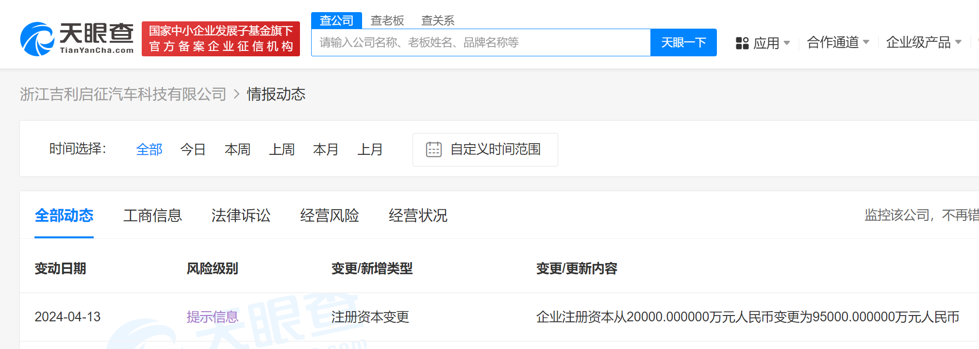 天眼查App显示,近日,浙江吉利启征汽车科技有限公司发生工商变更,注册资本由2亿人民币增至9.5亿人民币。