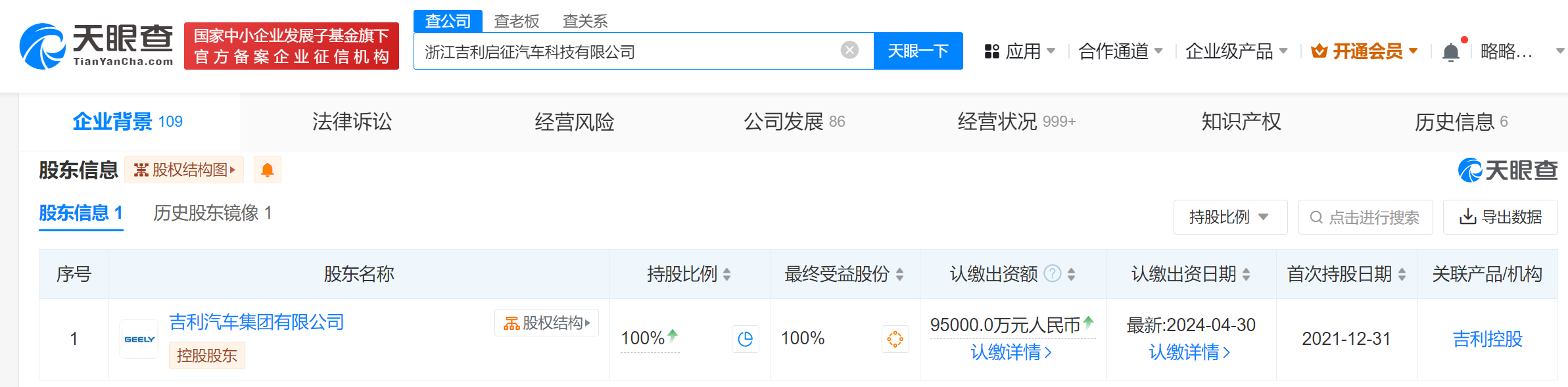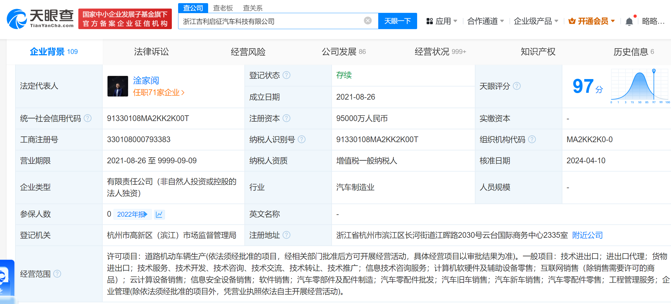 该公司成立于2021年8月,法定代表人为淦家阅,经营范围含互联网销售、云计算设备销售、汽车零部件及配件制造、汽车新车销售等。股东信息显示,该公司由吉利汽车集团有限公司全资持股。