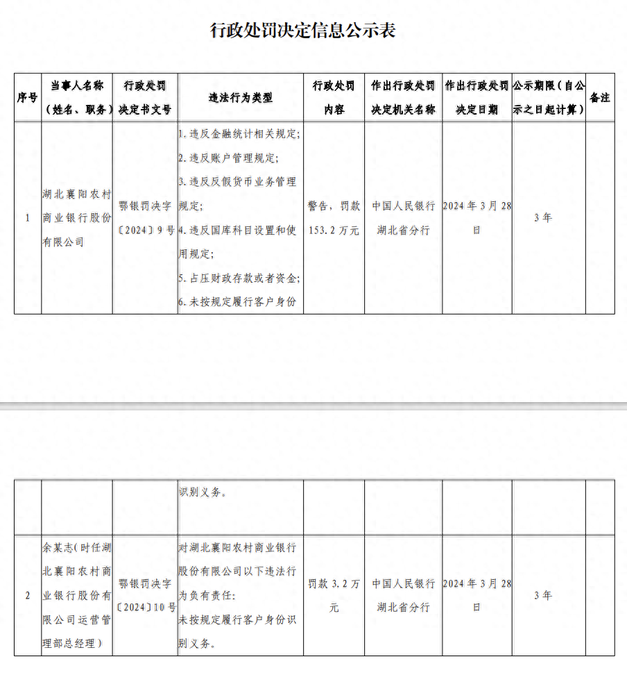 另据“鄂银罚决字〔2024〕10号”行政处罚决定书显示,时任湖北襄阳农村商业银行股份有限公司运营管理部总经理的余某志,对该行未按规定履行客户身份识别义务的违法行为负有责任,被罚款3.2万元。