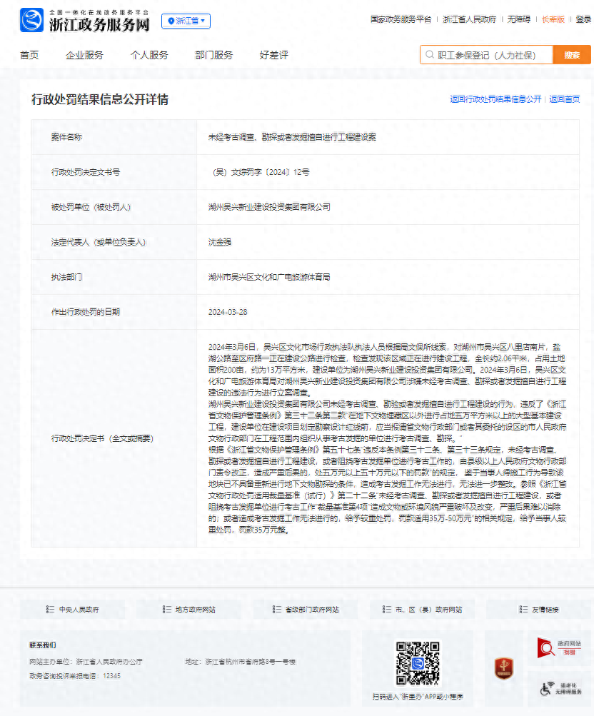 近日,浙江政务服务网披露,湖州吴兴新业建设投资集团有限公司未经考古调查、勘探或者发掘擅自进行工程建设被罚款35万元。