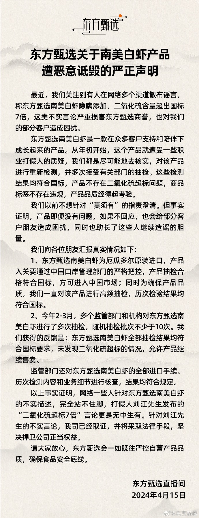 4月15日,东方甄选发文称,最近关注到,有人在网络散布东方甄选南美白虾相关谣言,严重损害东方甄选商誉,也对部分客户造成困扰。打假人刘江发布的“二氧化硫超标7倍”言论无中生有。针对刘江的不实言论,公司已经取证,并将采取法律手段,坚决捍卫公司正当权益。东方甄选表示,会一如既往严控自营产品品质,确保食品安全底线。