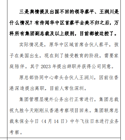 对于万科多位高管出国不回、管理层被边控等传闻,万科解释称,实际情况是: