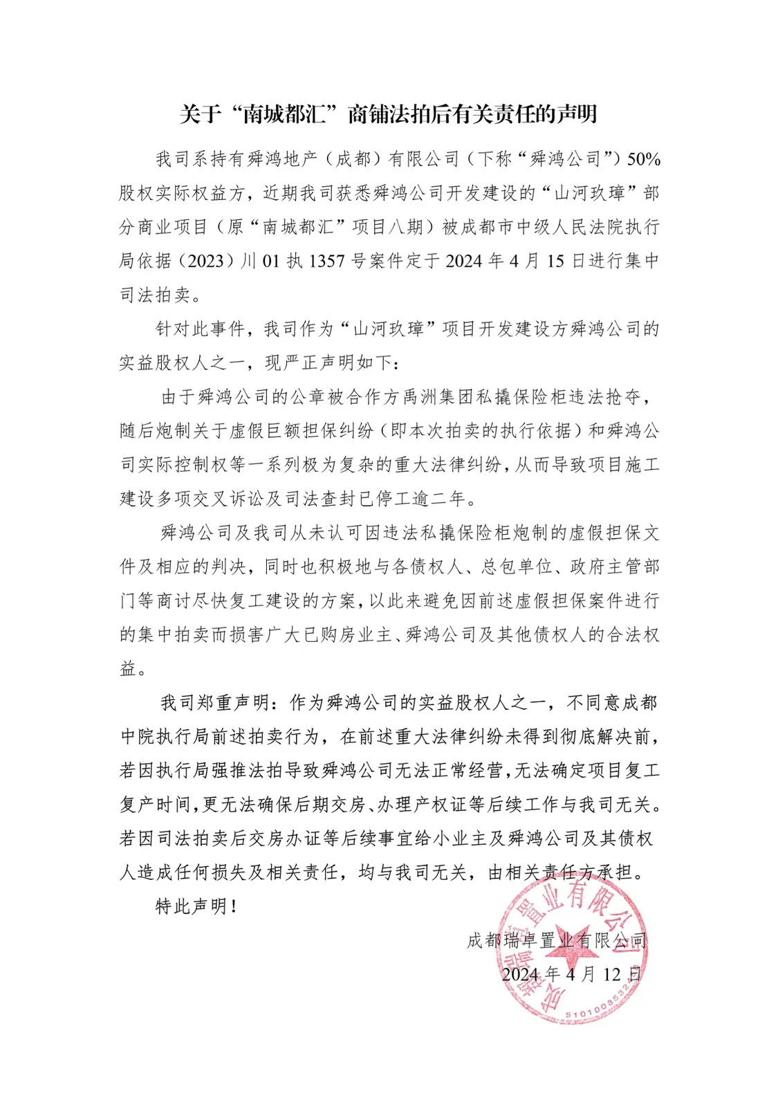 4月13日电,日前,成都瑞卓置业有限公司就位于成都的“南城都汇”商铺将被集中法拍发表声明。瑞卓置业称,其系持有舜鸿地产(成都)有限公司50%股权实际权益方,其近期获悉舜鸿公司开发建设的“山河玖璋”部分商业项目将于4月15日进行集中司法拍卖。瑞卓置业称,由于舜鸿公司公章被合作方禹洲集团私撬保险柜抢夺,以及一系列复杂法律纠纷,导致项目施工建设引发多项交叉诉讼及司法查封已停工逾二年;舜鸿公司及瑞卓置业从未认可因私撬保险柜炮制的虚假担保文件及相应的判决。