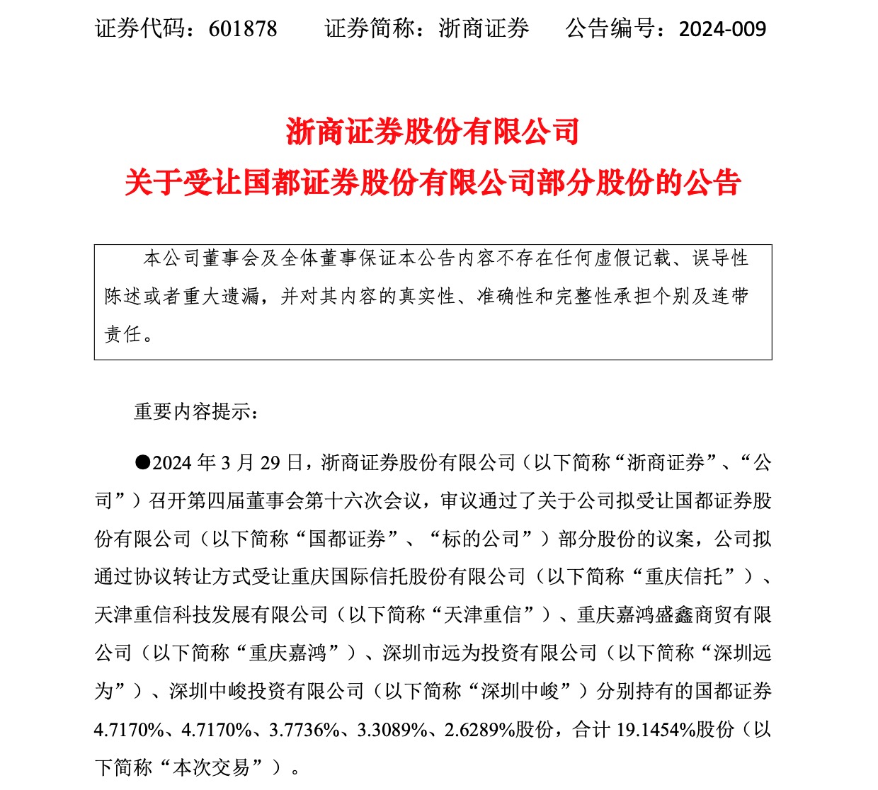 近年来,浙商证券处于扩张之路。去年的民生证券股权拍卖遗憾出局之后,浙商证券收购国都证券于近期迎来新进展。3月29日晚,浙商证券公告称,公司拟通过协议转让的方式,将从国都证券5名股东手中受让共计19.15%的国都证券股权,成为该券商第一大股东。