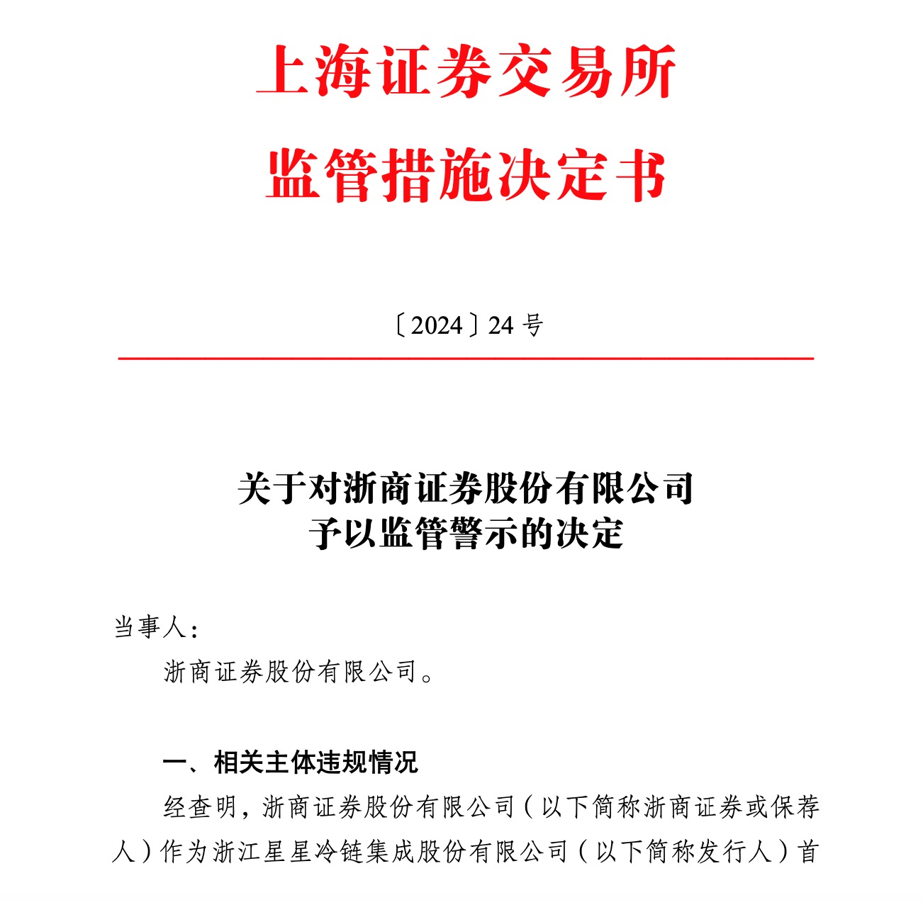 最终,上交所对浙商证券予以监管警示,对上述浙商证券两名保代予以3个月内不接受保荐代表人签字的发行上市申请文件及信息披露文件的纪律处分。星星冷链则因未如实说明首发上市聘请其他保荐机构的情形,公司及董事长、总经理、董秘三位相关责任人被通报批评。