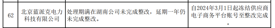 其中,北京蓝派克电力科技有限公司因“处理期满在湖南公司未完成整改,延期一年仍未完成整改”被通报。处理措施:自2024年3月1日起冻结其在电子商务平台的账号至整改完成。
