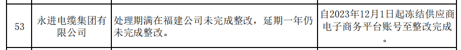 其中,永进电缆集团有限公司因“处理期满在福建公司未完成整改,延期一年仍未完成整改”被通报。处理措施:自2023年12月1日起冻结其在电子商务平台的账号至整改完成。