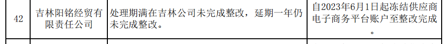 其中,吉林阳铭经贸有限责任公司因“处理期满在吉林公司未完成整改,延期一年仍未完成整改”被通报。处理措施:自2023年6月1日起冻结其在电子商务平台的账户至整改完成。