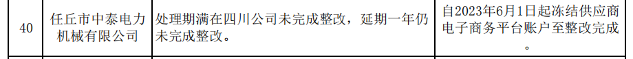 其中,任丘市中泰电力机械有限公司因“处理期满在四川公司未完成整改,延期一年仍未完成整改”被通报。处理措施:自2023年6月1日起冻结其在电子商务平台的账户至整改完成。