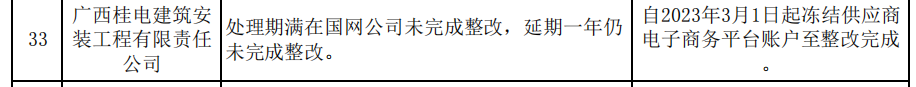 其中,广西桂电建筑工程有限责任公司因“处理期满在国网公司未完成整改,延期一年仍未完成整改”被通报。处理措施:自2023年3月1日起冻结其在电子商务平台的账户至整改完成。