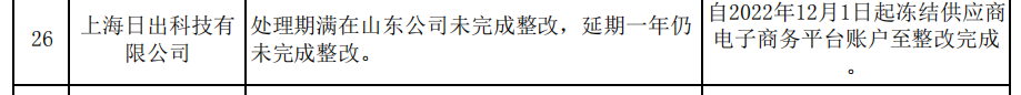 其中,上海日出科技有限公司因“处理期满在山东公司未完成整改,延期一年仍未完成整改”被通报。处理措施:自2022年12月1日起冻结其在电子商务平台的账户至整改完成。
