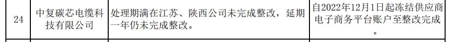 其中,中复碳芯电缆科技有限公司因“处理期满在江苏、陕西公司未完成整改,延期年仍未完成整改”被通报。处理措施:自2022年12月1日起冻结其在电子商务平台的账户至整改完成。